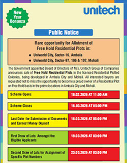 Public notice for sale of free hold Residential Plots in Ambala & Mohali